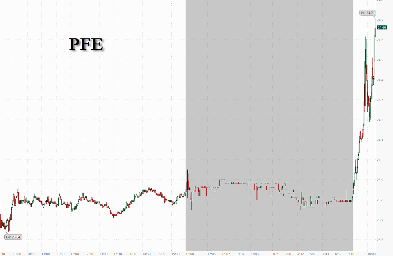 Shares of pharmaceutical giant Pfizer sprinted higher in early trade Tuesday after reports that later today, President Trump and CEO Albert Bourla, will announce that the company will sell drugs at lower prices to the US Medicaid insurance program as part of a deal to advance the Trump administration’s “most favored nations” agenda.